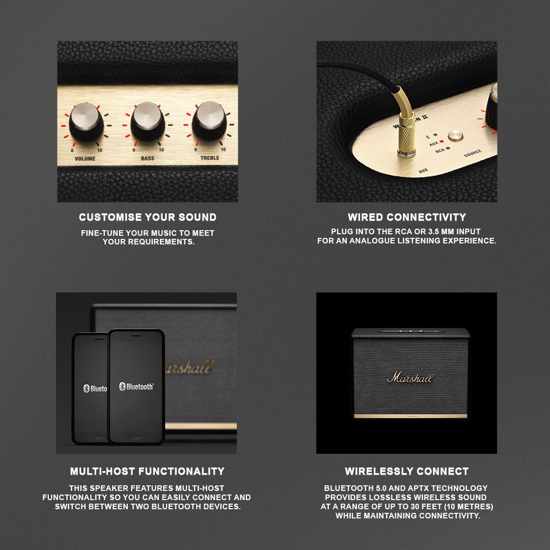 This speaker has a wooden cabinet construction that features two 2.54-centimetre (1) tweeters and dual 13.33-centimetre (5.25) subwoofers. This setup delivers clean treble, lifelike midrange, bass notes that will impress you. This Bluetooth speaker has brass knobs that can be used to adjust the volume, treble and bass. You can use the Marshall app to customize the sound to your liking.